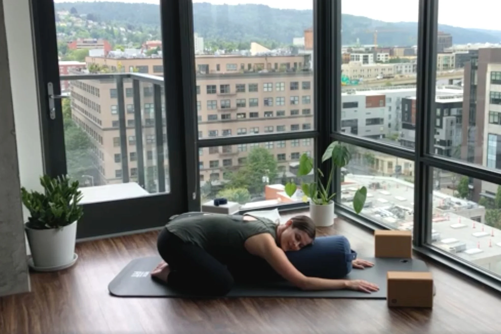 Another modification for later stages of pregnancy is the supported Child's Pose. Begin by sitting back on your heels, and then use a bolster or a stack of blankets to support your upper body. Lean forward, allowing your chest and forehead to rest on the prop. This variation offers a gentle stretch to the back and hips while maintaining stability and comfort.